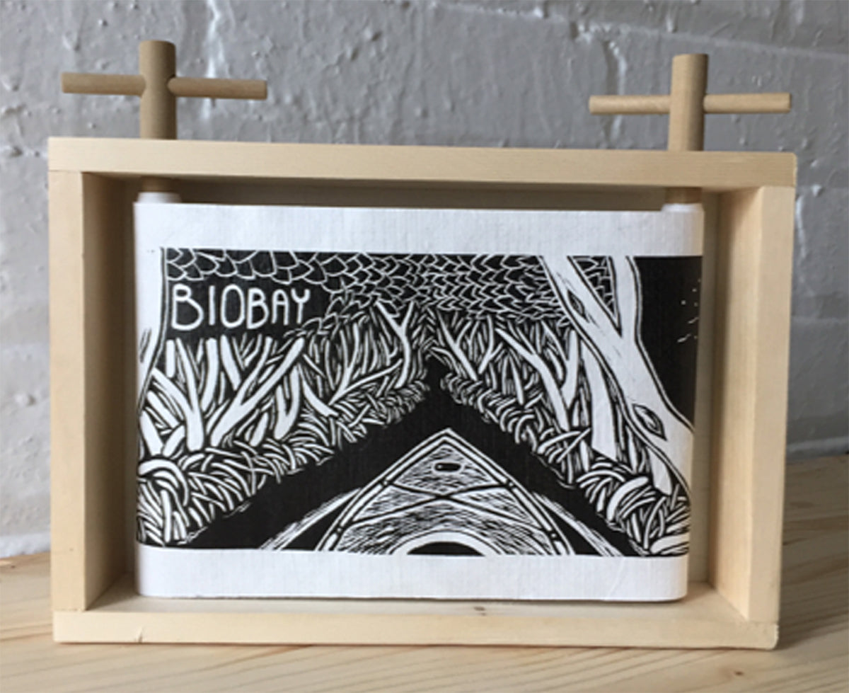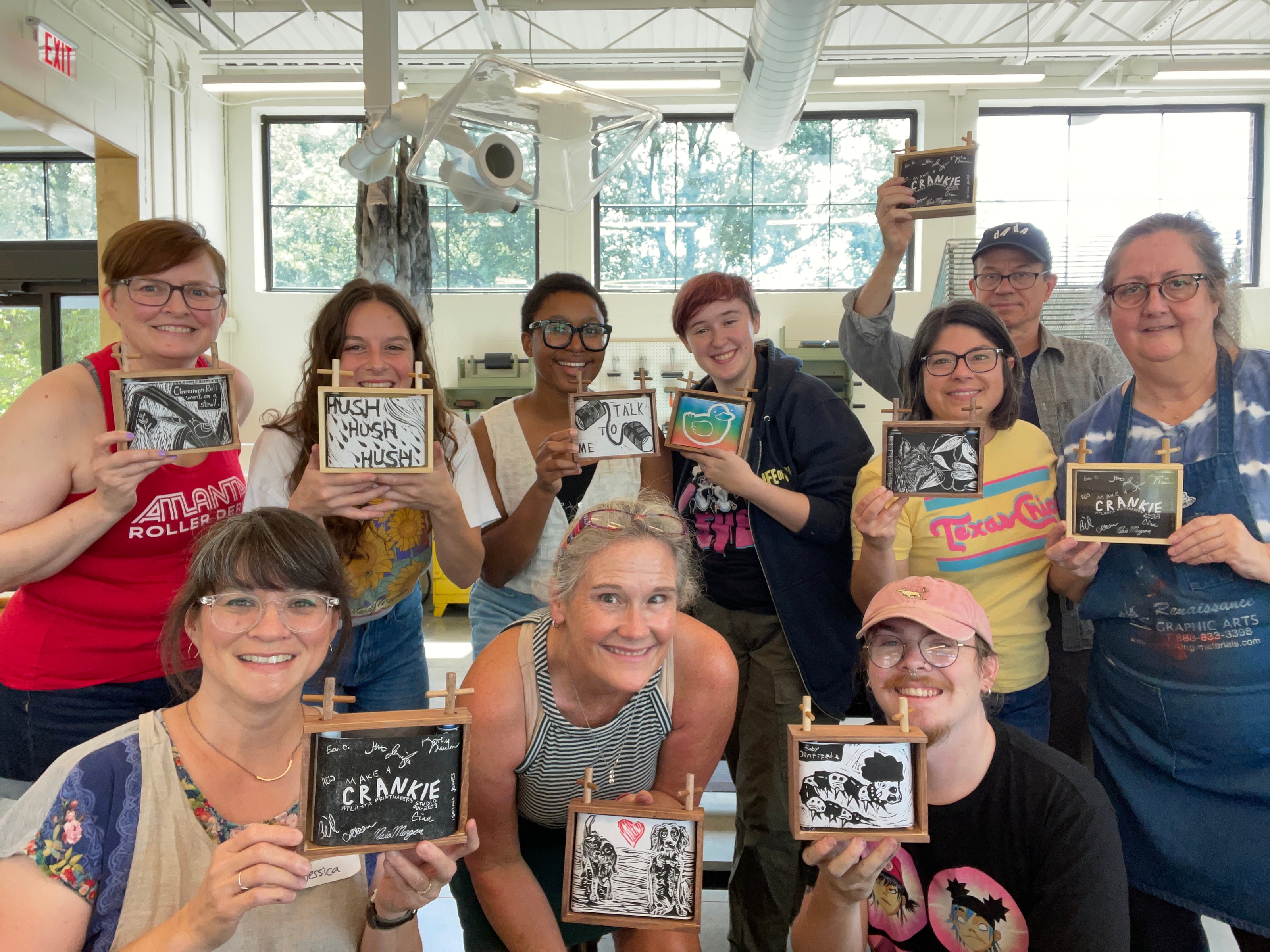 Crankies are illustrated scrolls in boxes with attached handles that are "hand cranked" to create a moving panorama, inviting the viewer to experience the images like watching a movie. These historic storytelling devices were traditionally used to illustrate ballads sung by traveling musicians as they performed through the Appalachian mountains. Carve blocks to print smaller "personal" crankies as well as collaborate on a single long scroll to create a shared experience.